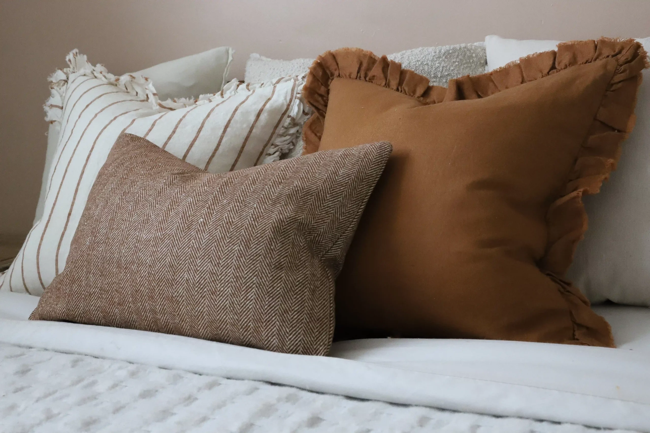 Linen cushions are perfect for a relaxed, natural look. Known for its durability and breathable quality, linen adds an effortless charm to your decor, making it a versatile choice for both modern and rustic interiors. A few special mentions would be the Esmee Rust Pinstripe, Hallie Brown and Cream Stripe, and the Hallie Terracotta.