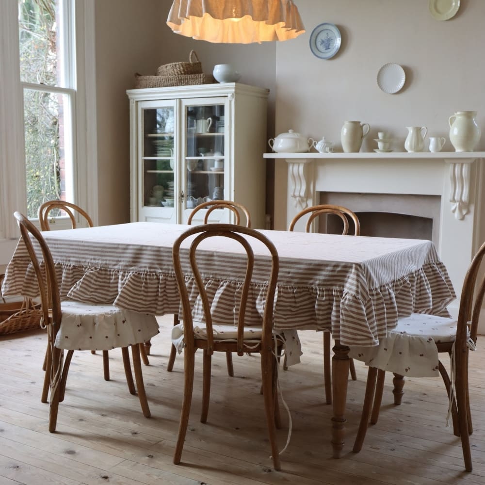 Bring timeless charm to your table with our Brown Stripe Ruffle Tablecloth. Crafted from soft, durable cotton, this cotton tablecloth features a classic brown stripe design paired with a stylish ruffle edge detail for just the right balance of casual and refined. The neutral finish makes this ruffle tablecloth easy to transition through the seasons. Whether styled for everyday meals or special gatherings, it adds warmth, texture, and effortless elegance to any setting.