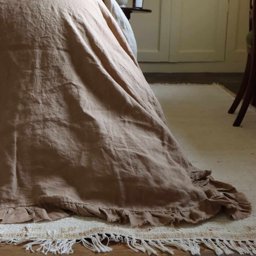 Enhance your bedroom styling with the Coffee Brown Ruffle Linen Bedspread. A rich and lightweight bedspread, with a delicate ruffle edge detail. This bedspread features a one-sided design, with the reverse left plain for a relaxed finish.