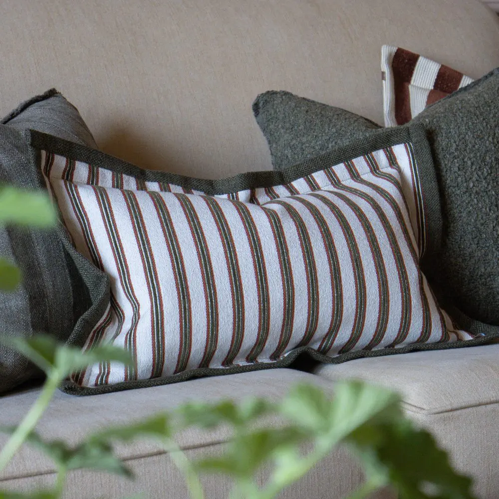 The Fleur Olive and Terracotta Stripe Cushion 50×30 pairs perfectly with our Della Olive Green Throw. The flanged edge detail adds visual interest, while the terracotta and olive green tones keep the cushions rustic look. We recommend to style this rectangle cushion in front of a bedroom cushion display, or on its own as a stand alone cushion on an arm chair.
