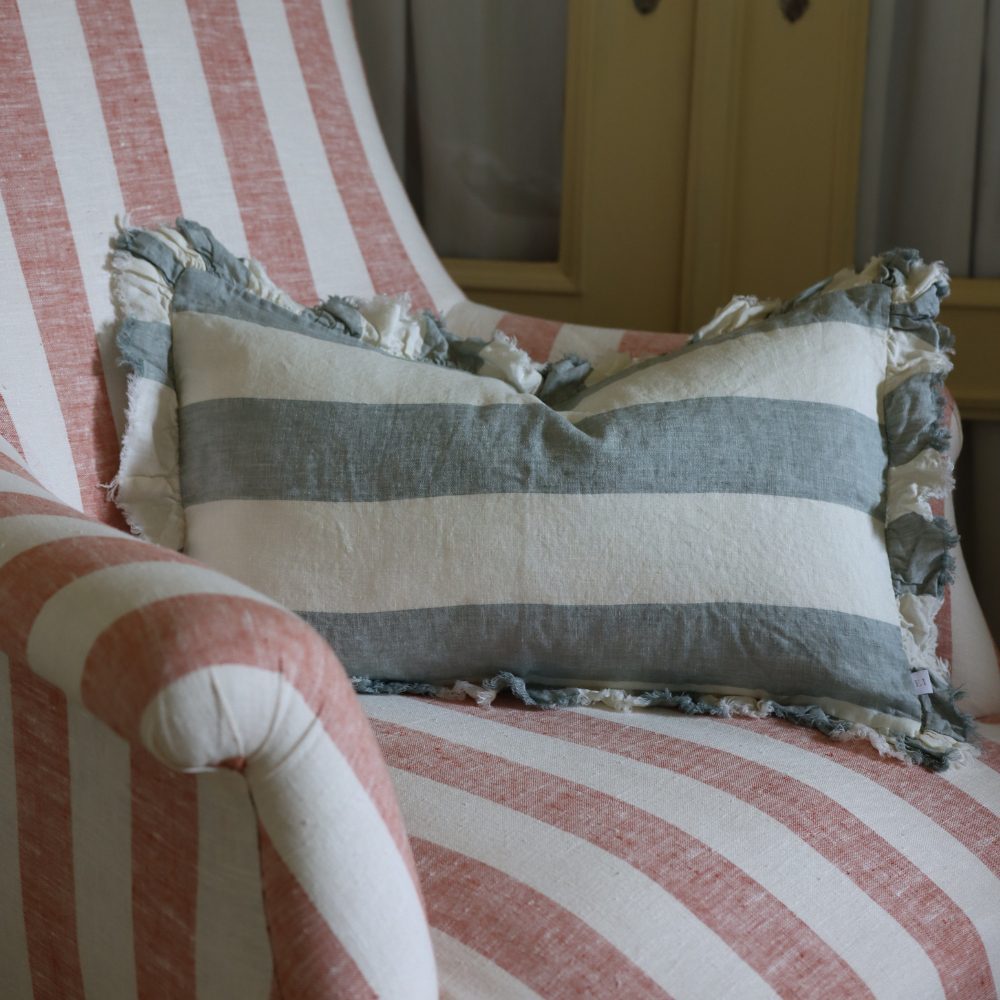 Introducing the Hallie Teal Wide Stripe Cushion 50×30. A sublime addition to your home decor that seamlessly blends comfort and timeless charm. If you’re looking for sofa or bed cushions this blue cushion will make the perfect addition.