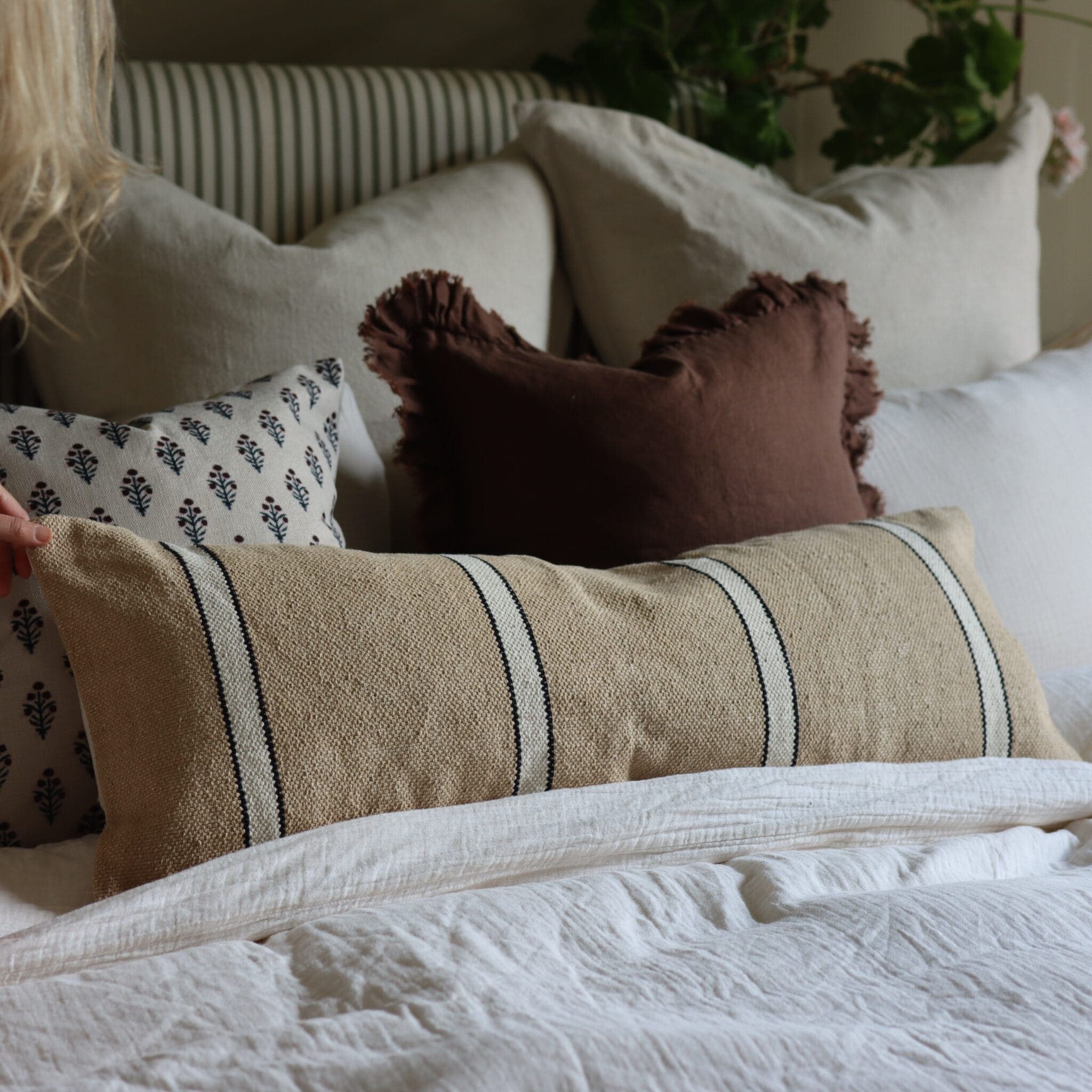 Whether used as a standalone accent piece or paired with complementary cushions and throws, the India Beige, Black & Cream Bolster Cushion adds a touch of sophistication and warmth to any space. Moreover, its versatile design makes it suitable for various decor themes.  From rustic farmhouse to urban chic,  this striped cushion effortlessly integrates into any interior scheme.