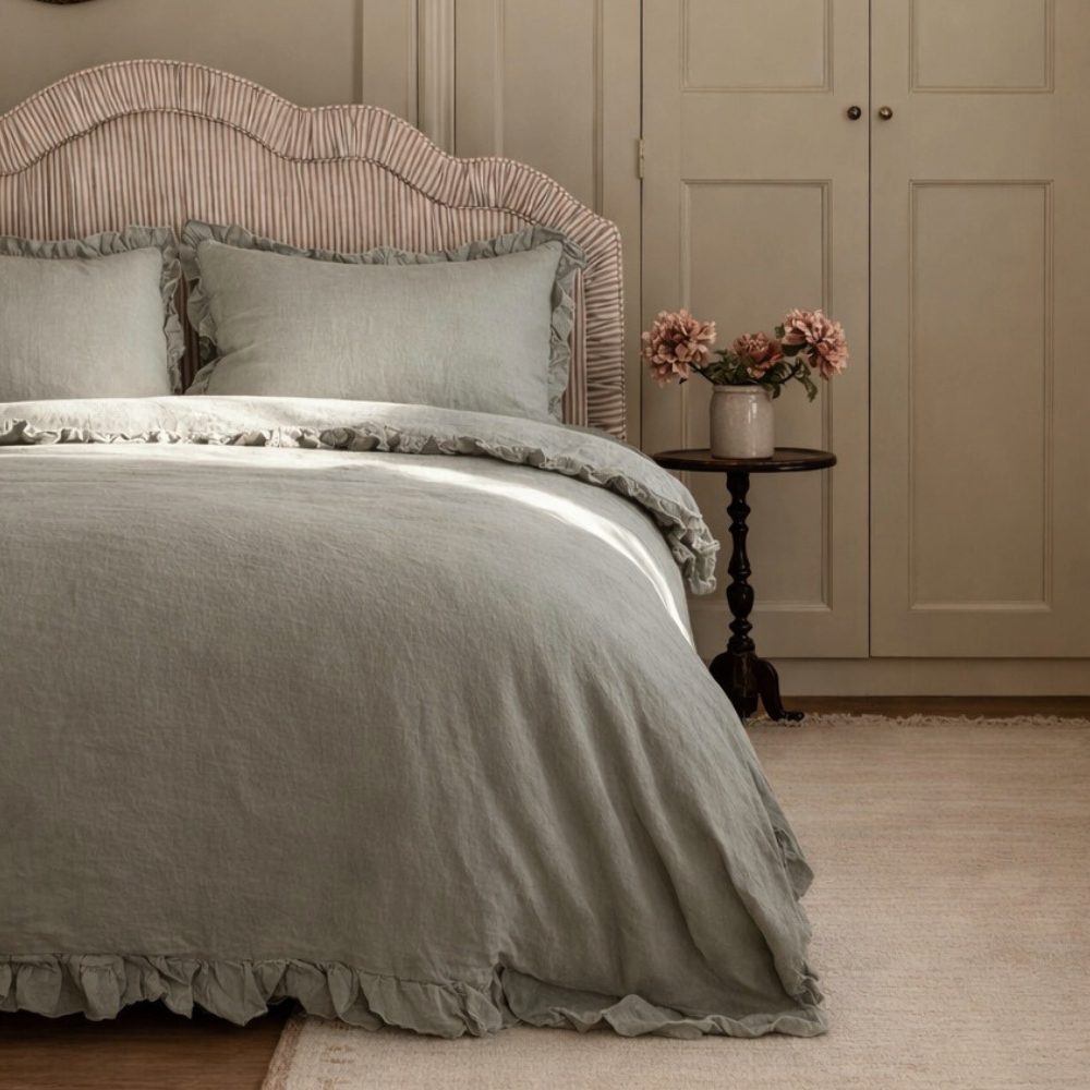 The Luxury Sage Green Ruffle Linen Bedding Set includes a beautifully crafted duvet cover and two matching pillowcases. Made from high-quality linen, this set offers breathable comfort and timeless style. Designed as our spring colourway, the soft sage green tone brings a fresh, calming feel to your bedroom, while the delicate ruffle edging adds an elegant decorative finish.