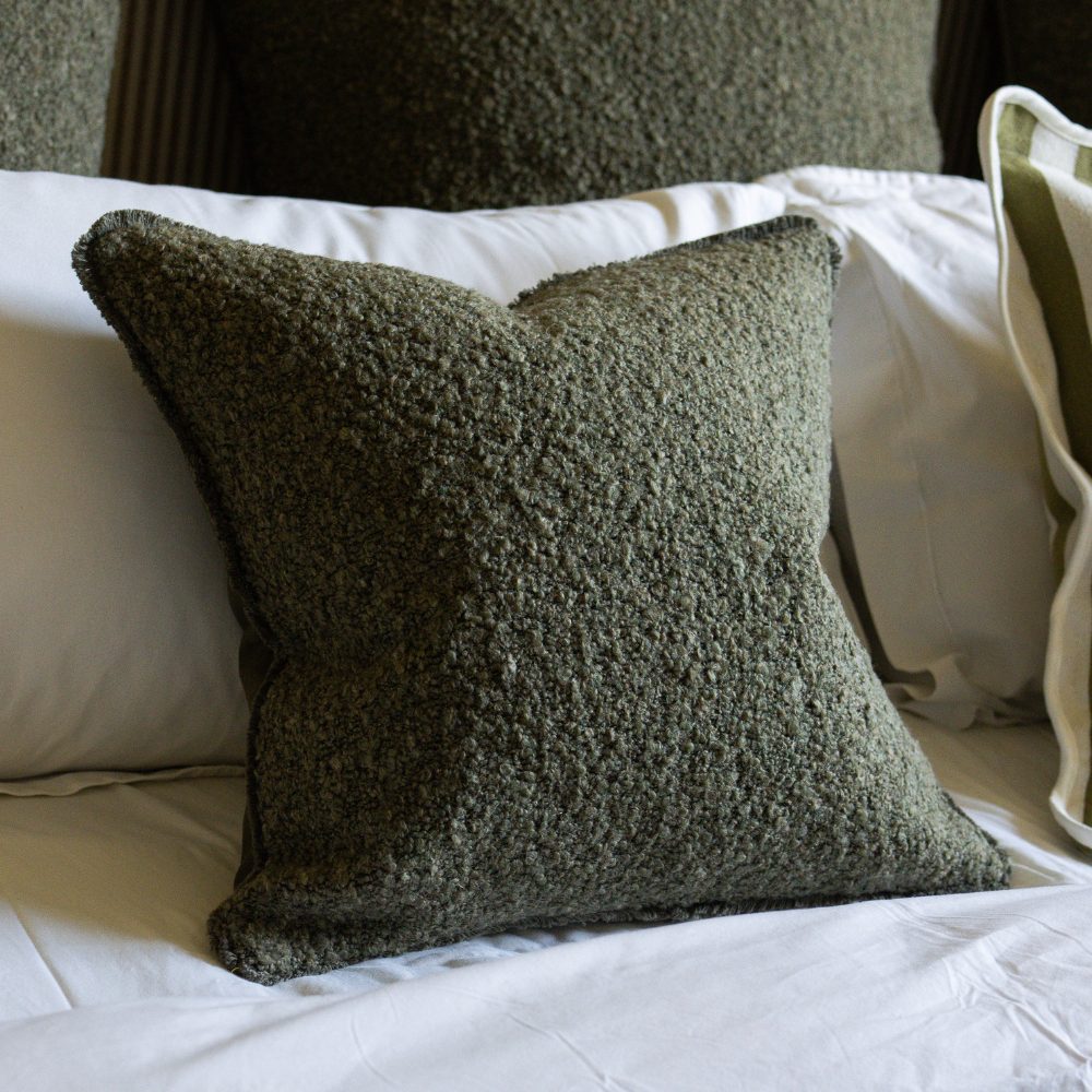 Introducing the Sofia Olive Green Boucle Cushion. A a luxurious addition to elevate your home decor. Crafted with meticulous attention to detail, this boucle cushion seamlessly blends style and comfort to create a cosy haven in any living space.
