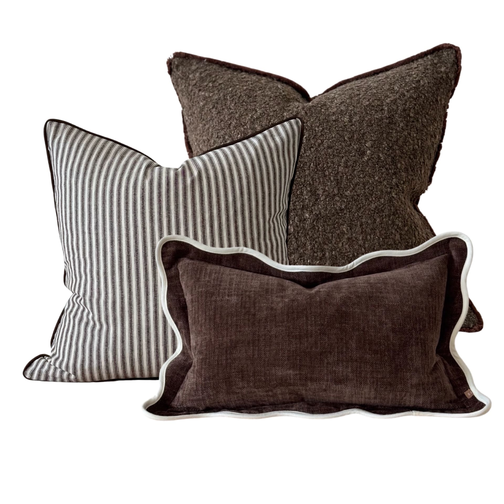 Versatility meets creativity with The Dark Brown Boucle Cushion Combination. Mix and match sizes and shapes to curate your personalised oasis. Express your unique style and infuse your space with a touch of individuality effortlessly. We designed our cushion sets with customer satisfaction at the forefront. We wanted to take the stress out of having to pair cushions online. In addition, when purchasing one of our cushion sets you are guaranteed to get a cohesive look that has been hand picked by our in-house stylists.